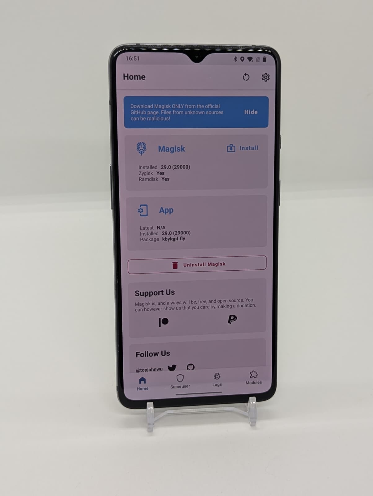 Magisk V29 installed (has the ability to hide root from apps)